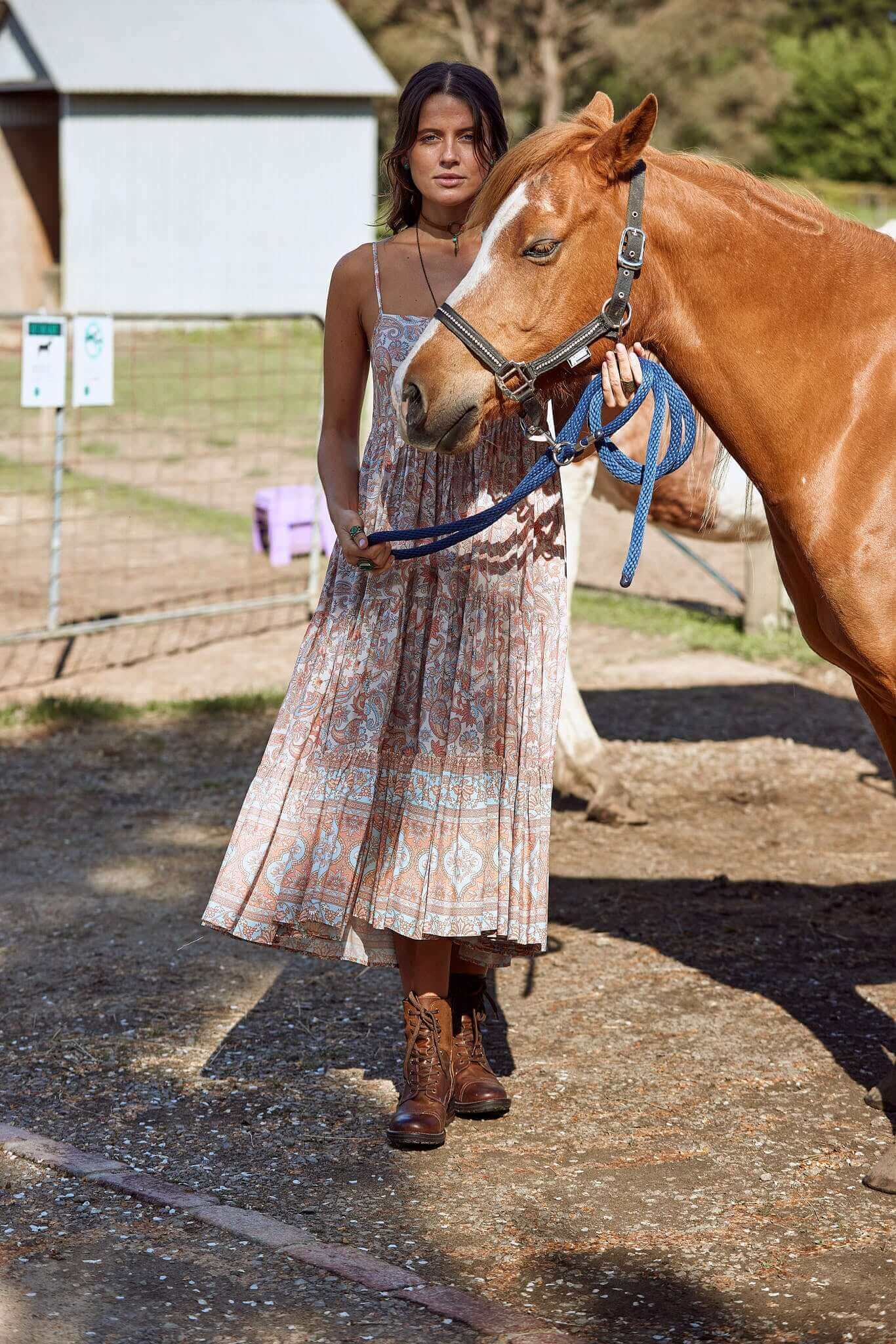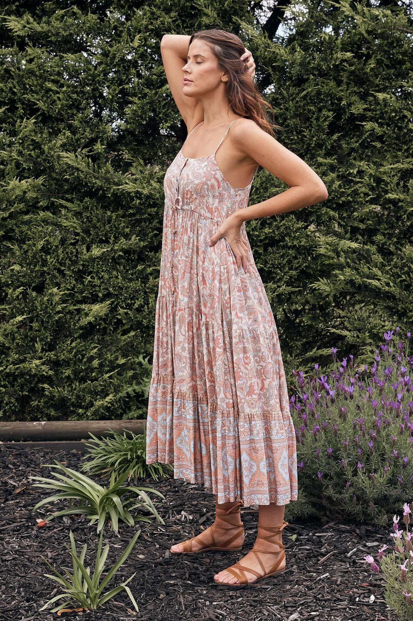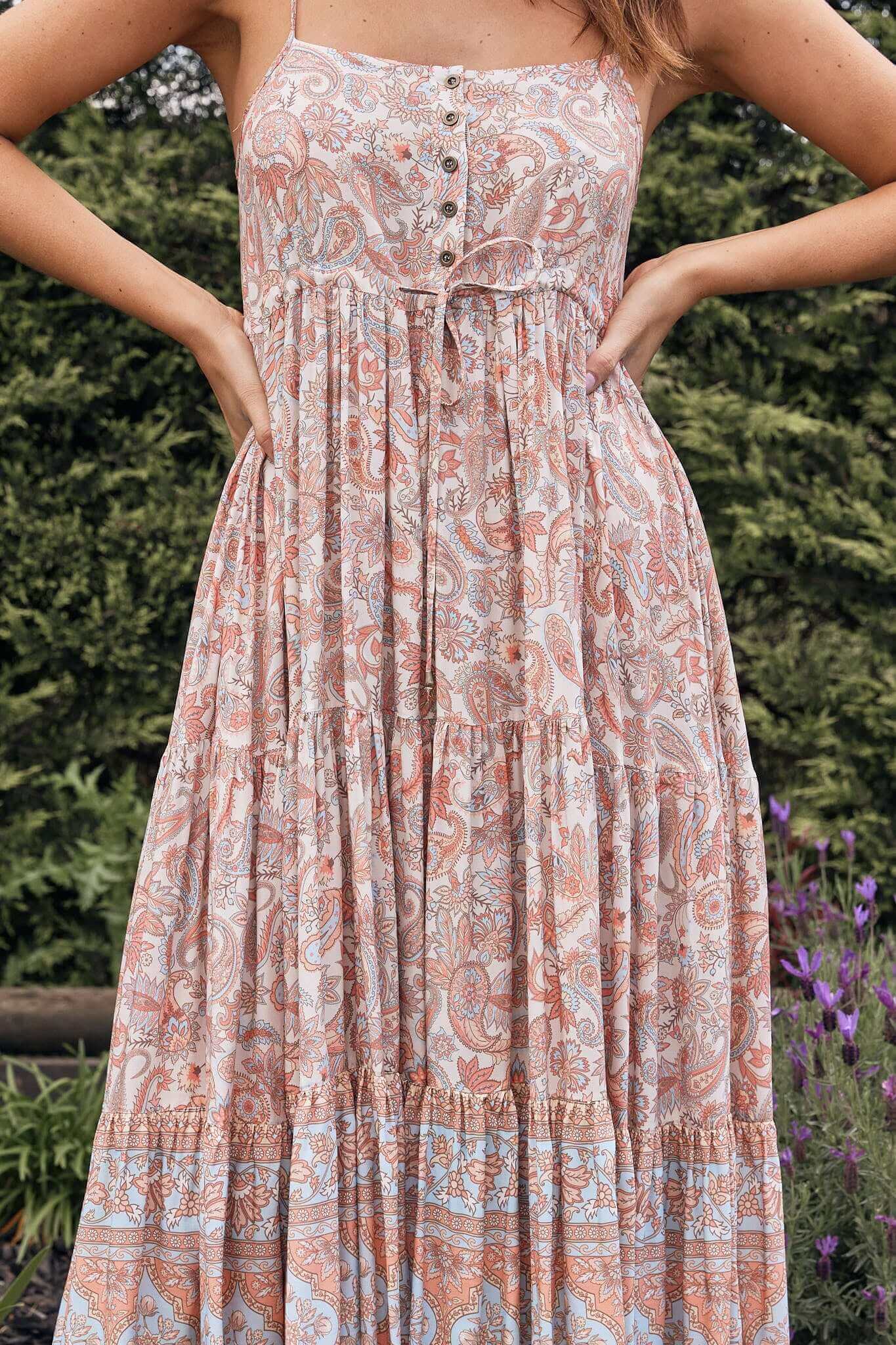 Elevate your dressing with this pretty timeless Heer strappy Midi dress. Crafted with flawless attention to detail. Stylish, versatile and easy to wear, our Heer Midi Dress has multiple tiers. Featuring stunning subtle colour nostalgic Paisley print with distinctive boho Indian border.