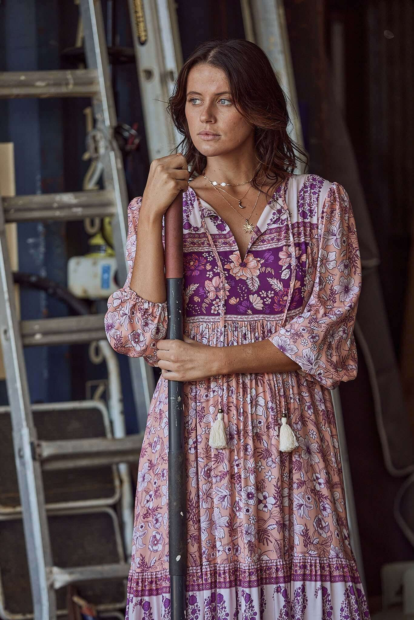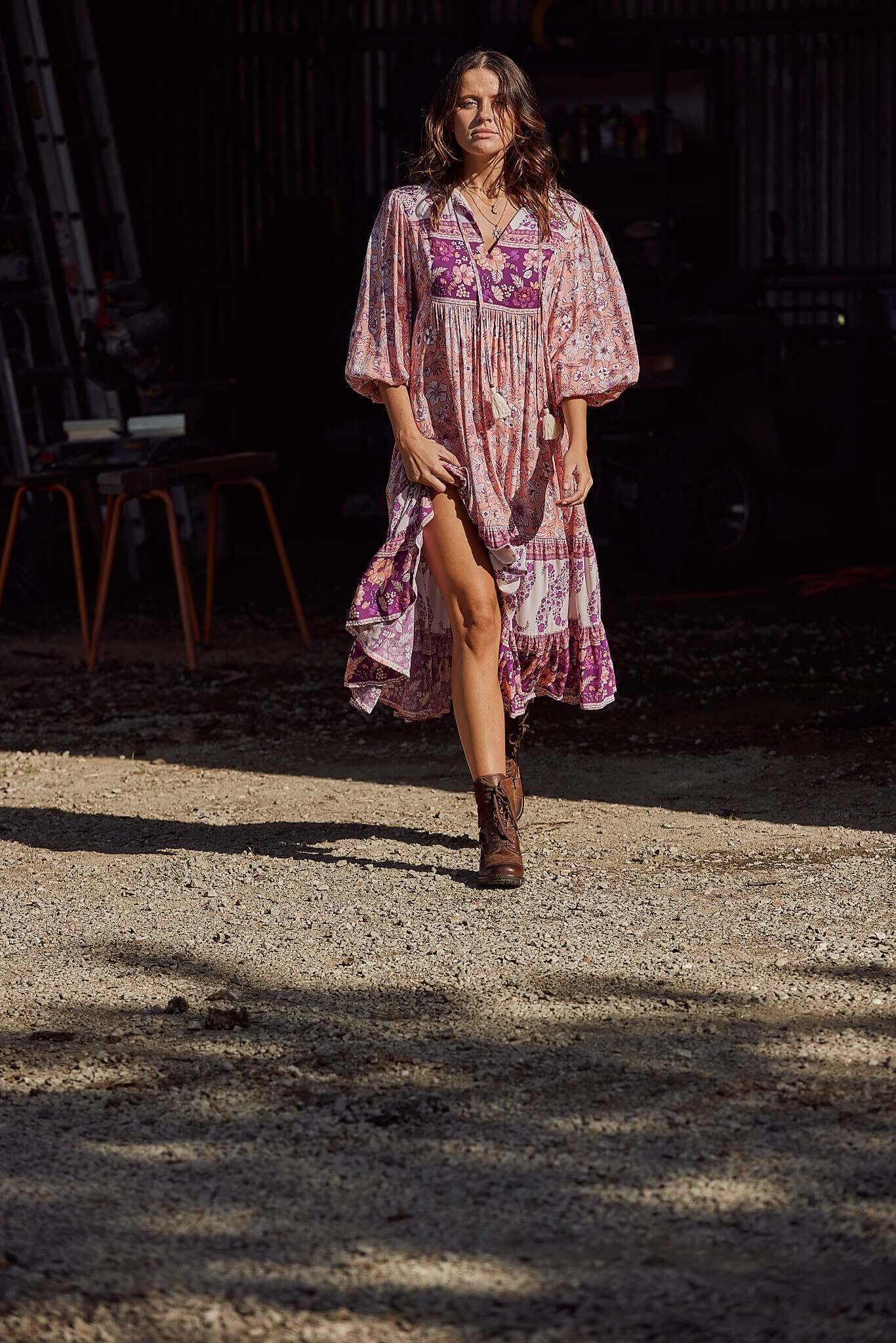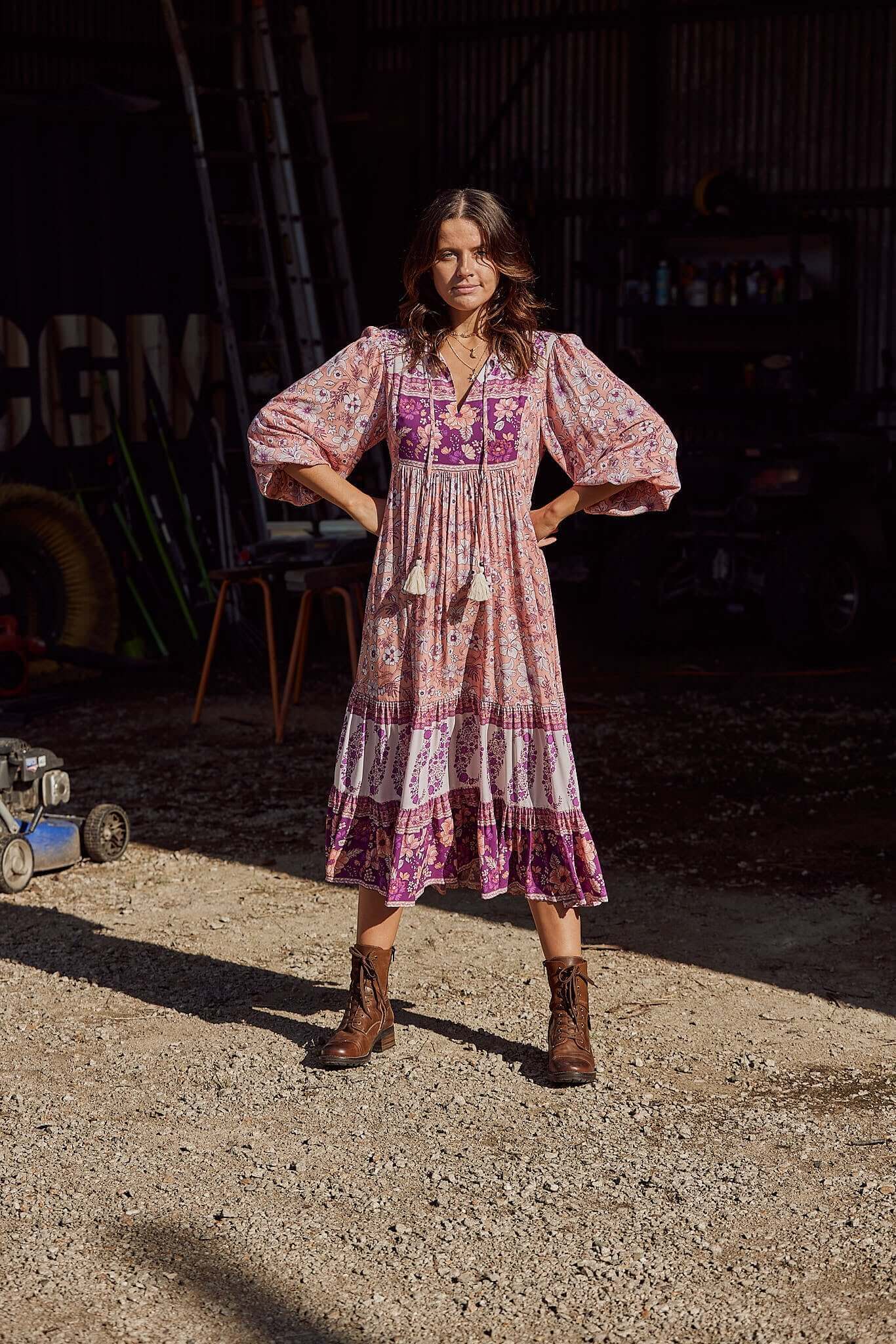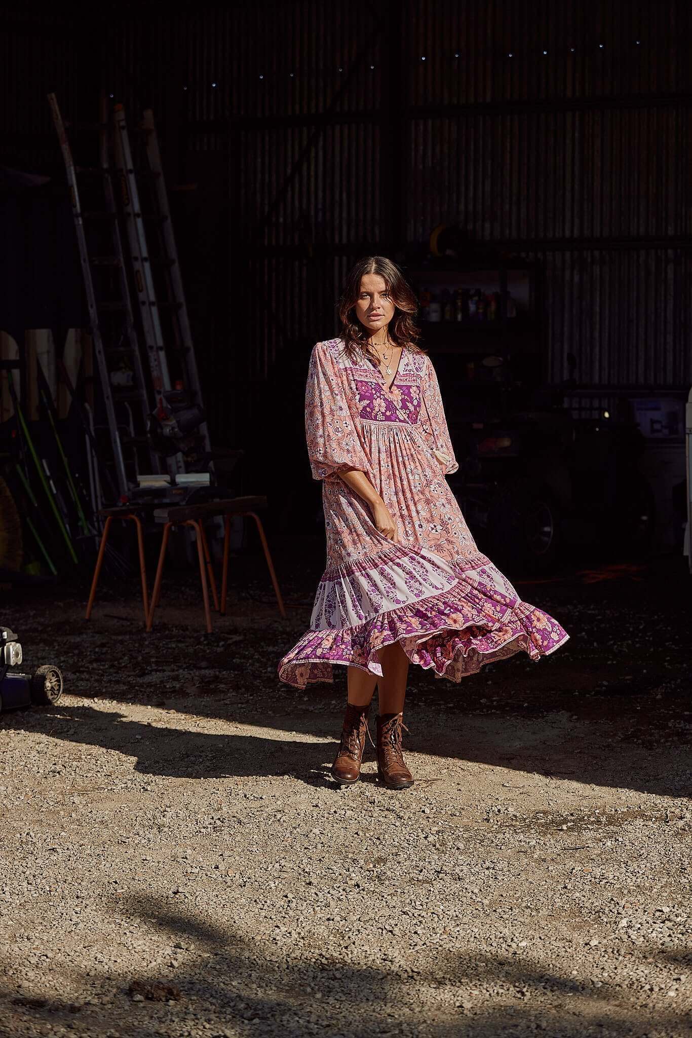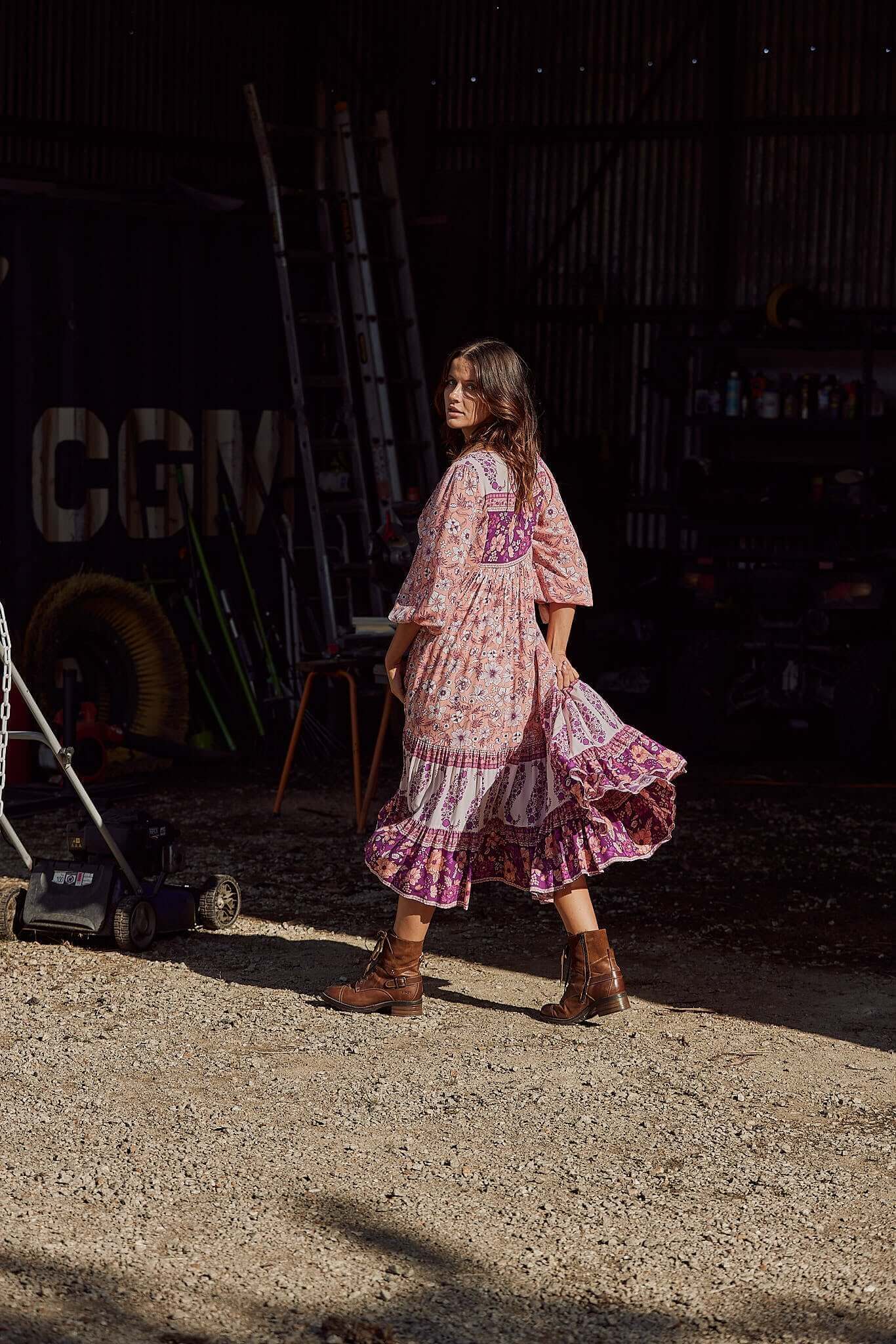 - Multiple tiers gathered skirt for a full and voluminous flow