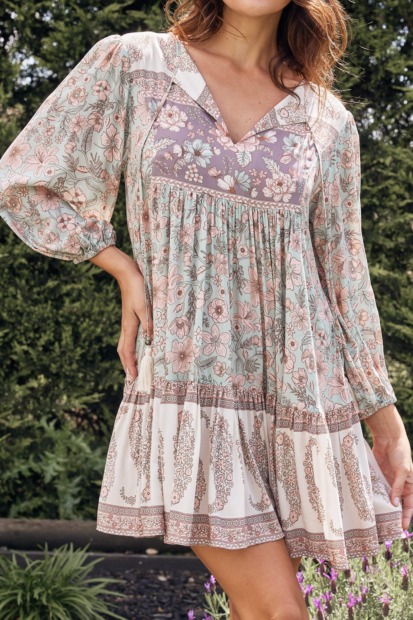 Add some floral aroma in your wardrobe with this serene beauty. Our timeless Noor Mini dress is Crafted with flawless attention to detail. Featuring stunning floral print with distinctive boho paisley border. Highly breathable and soft feel of the fabric makes this elegant chic dress exceptionally comfortable. Bohemian aesthetic print and style is sure to suit any event. This beauty can be paired with ankle boots to tap into the boho aesthetic.