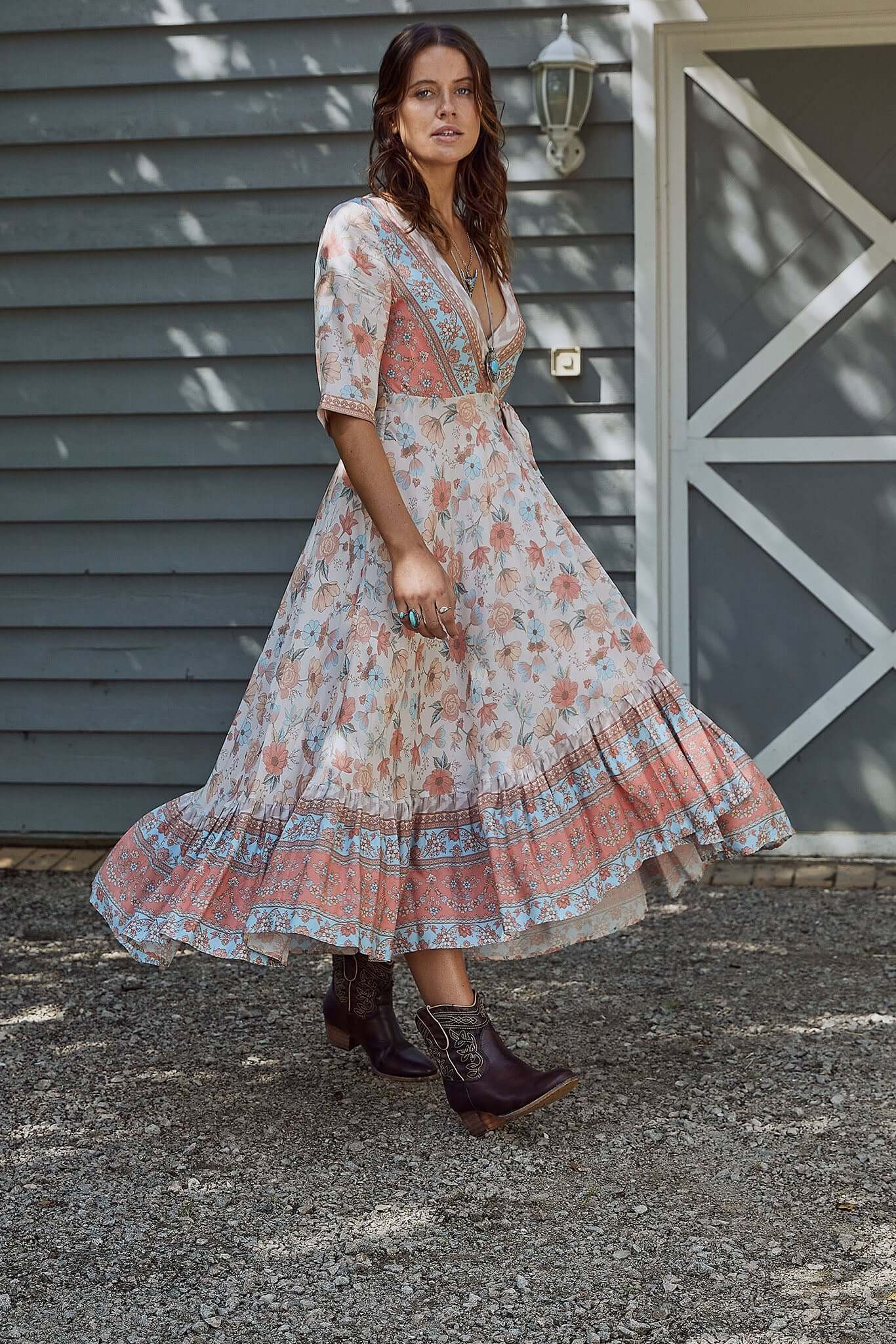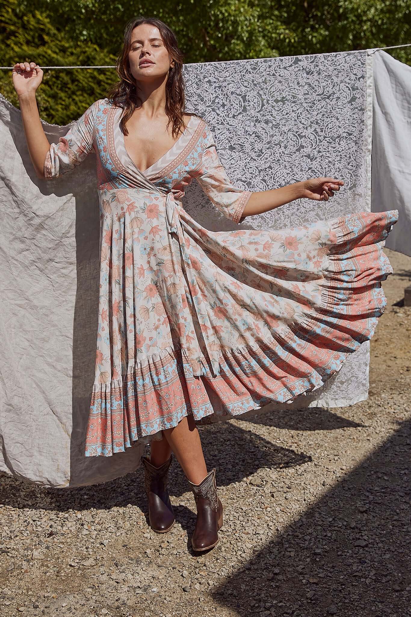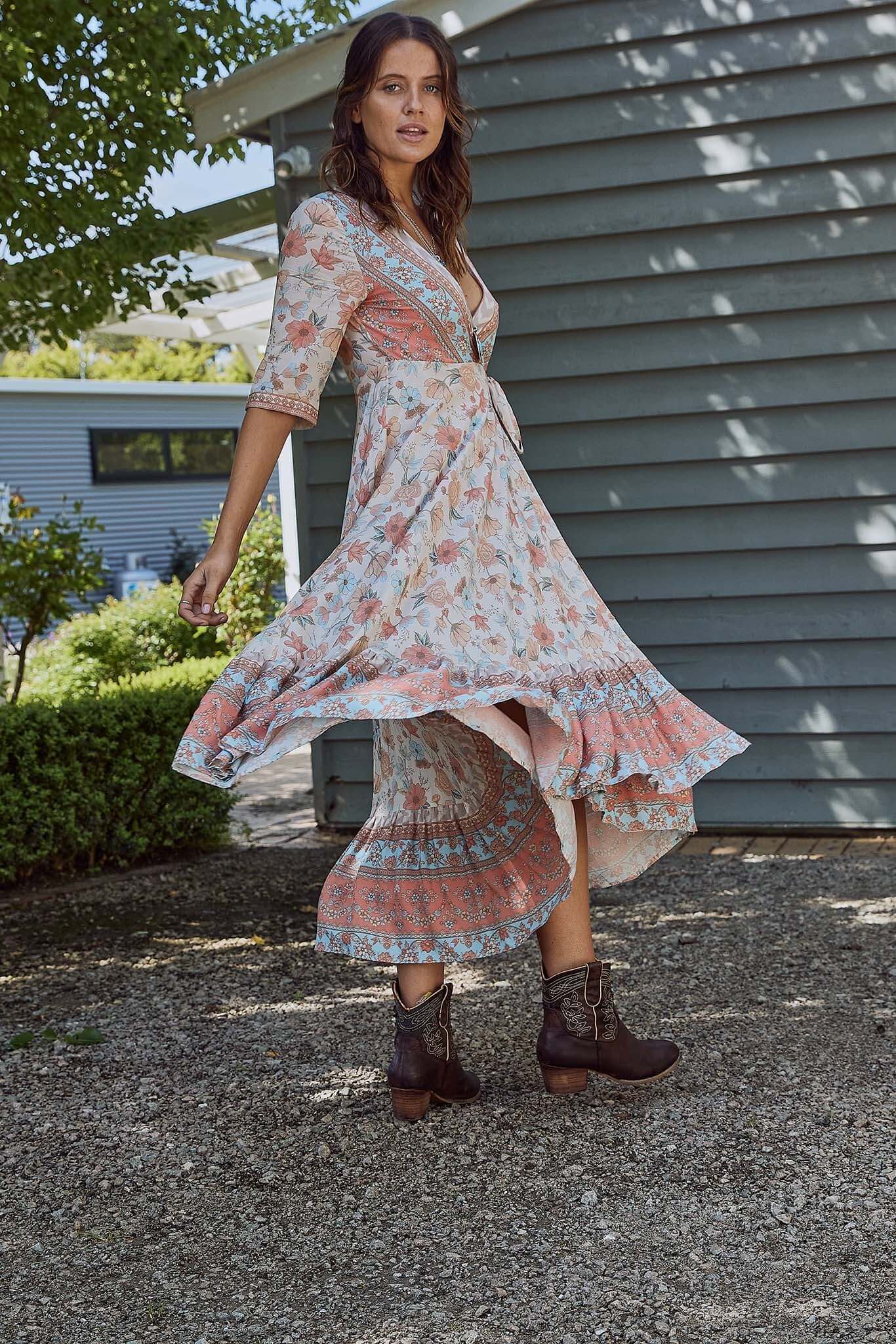 An essential addition to your bohème collection that will make you fall in love with the romantic floral print, Fit and flare silhouette of Saba wrap dress is stylish, comfortable and versatile perfect for leaving an impression. This poetic beauty featuring feminine print with coastal colours taking you to the warm beach. Wear this beauty as wrap dress or an open Kimono.